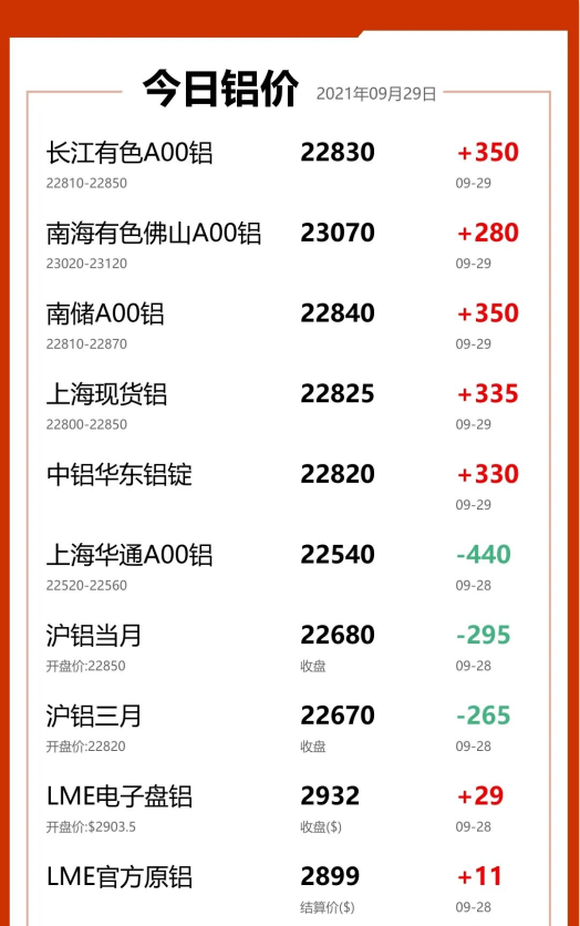 2021年9月29日中鋁報價華東鋁錠價格22820上漲330; 華南鋁錠價格22840上漲350; 西南鋁錠價格22775上漲335; 中原鋁錠價格22660上漲320。